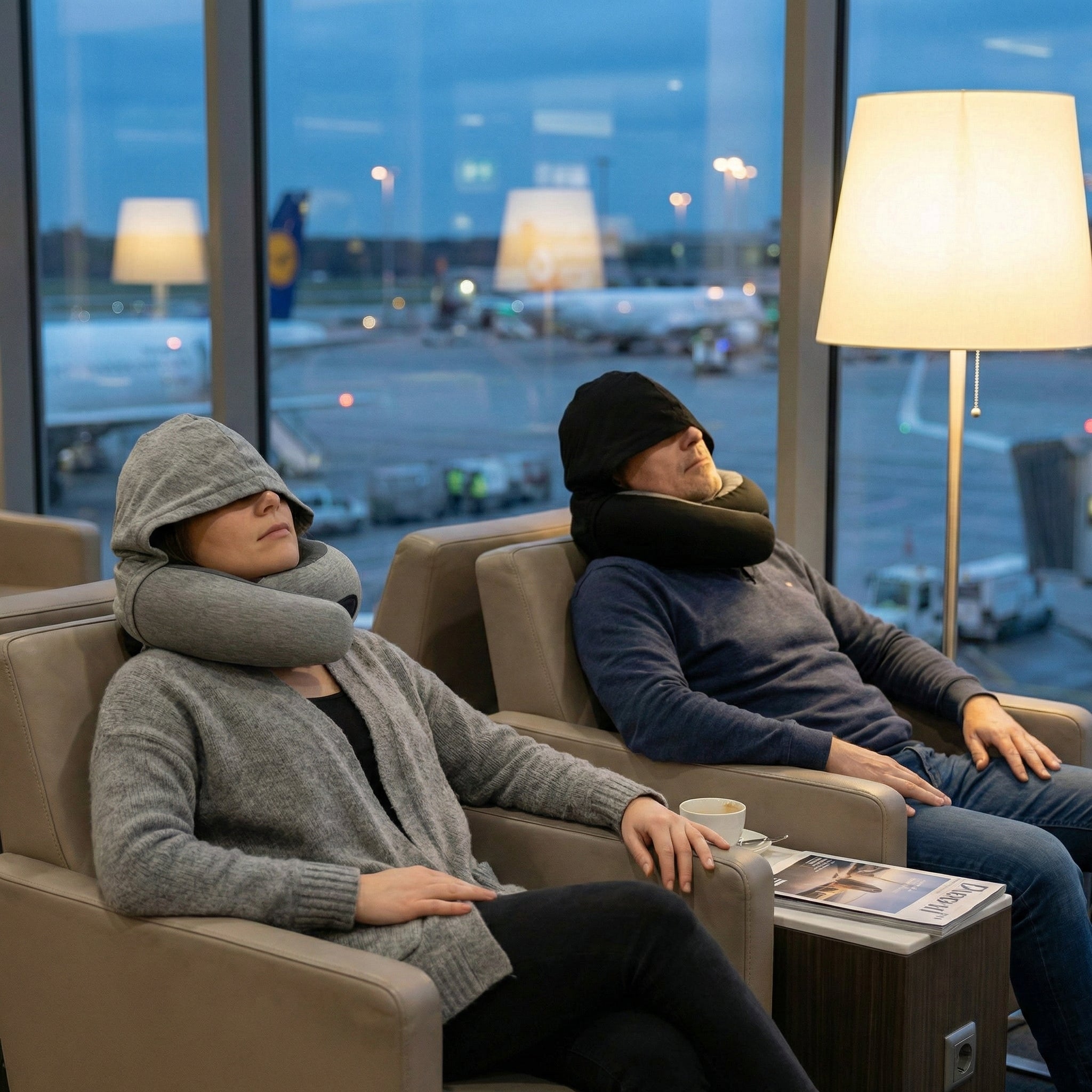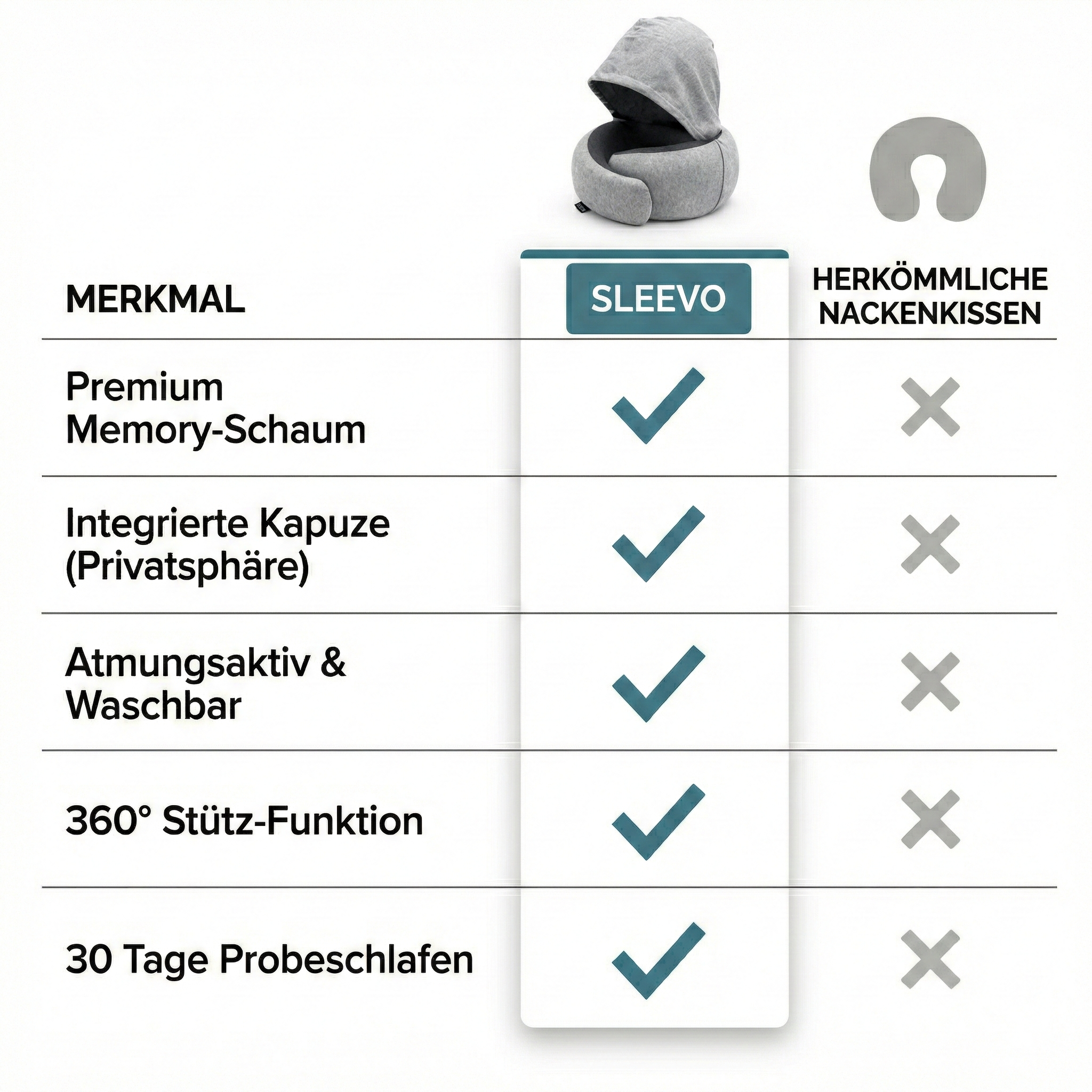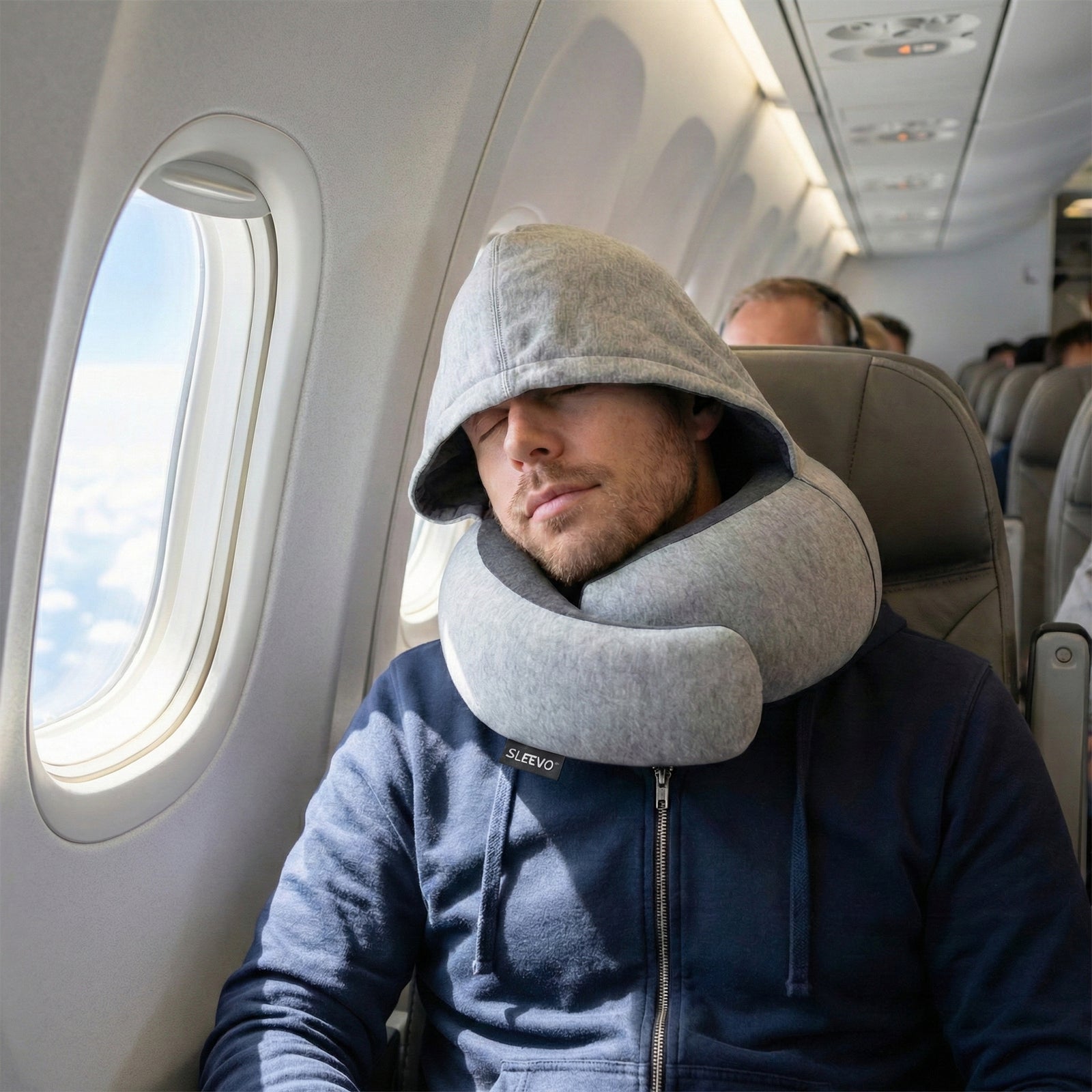 Sleevo kombiniert hochwertigen Memoryschaum mit der innovativen 360°-NeckEase-Technologie für rundum optimale Nackenstütze. Die integrierte Kapuze schützt zuverlässig vor Zugluft, Kälte, Licht und neugierigen Blicken. Dank verstellbarem Klettverschluss passt sich das Kissen individuell an dich an. Geprüfte Qualität, angenehm leicht, kompakt verstaubar und waschbar – ideal für jede Reise.