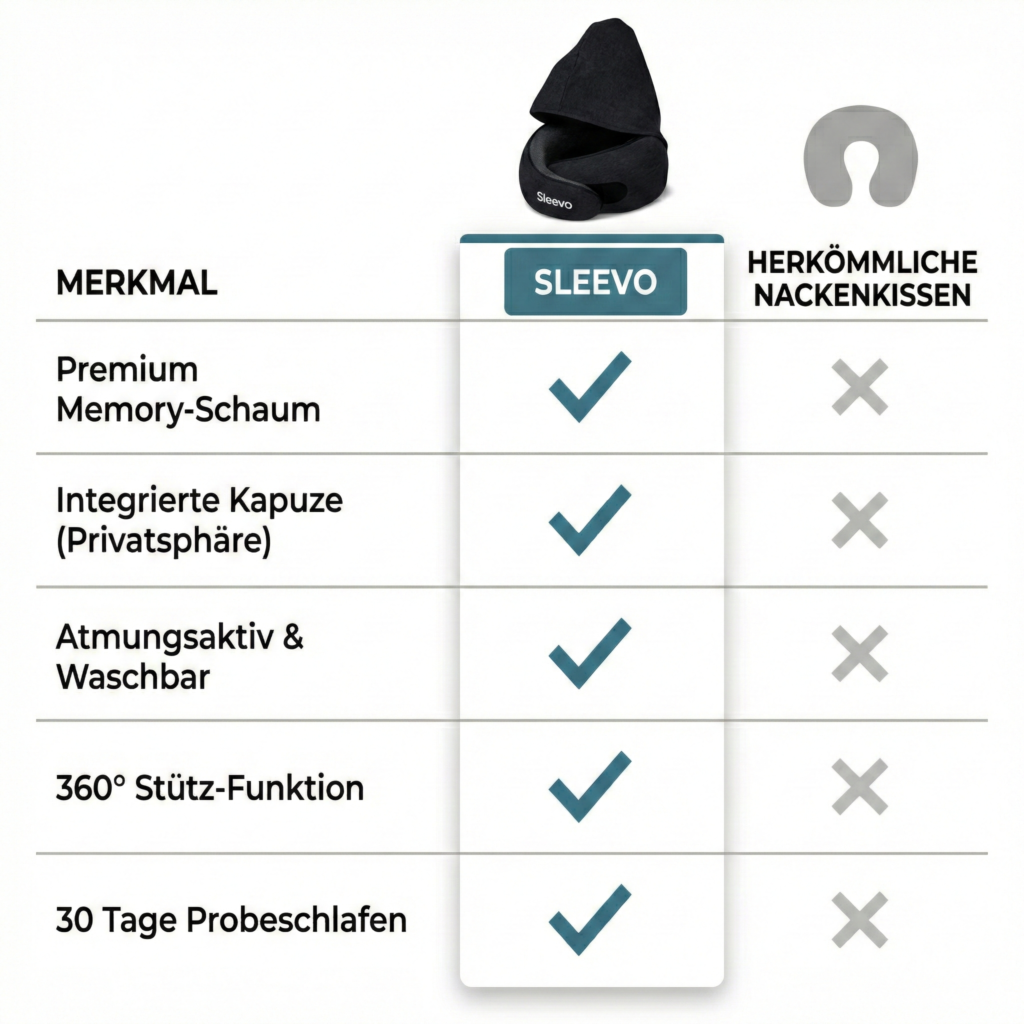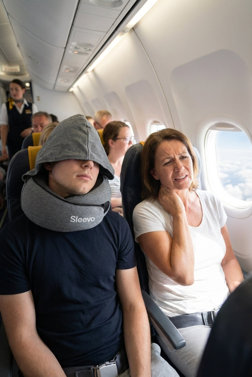 Sleevo kombiniert hochwertigen Memoryschaum mit der innovativen 360°-NeckEase-Technologie für rundum optimale Nackenstütze. Die integrierte Kapuze schützt zuverlässig vor Zugluft, Kälte, Licht und neugierigen Blicken. Dank verstellbarem Klettverschluss passt sich das Kissen individuell an dich an. Geprüfte Qualität, angenehm leicht, kompakt verstaubar und waschbar – ideal für jede Reise